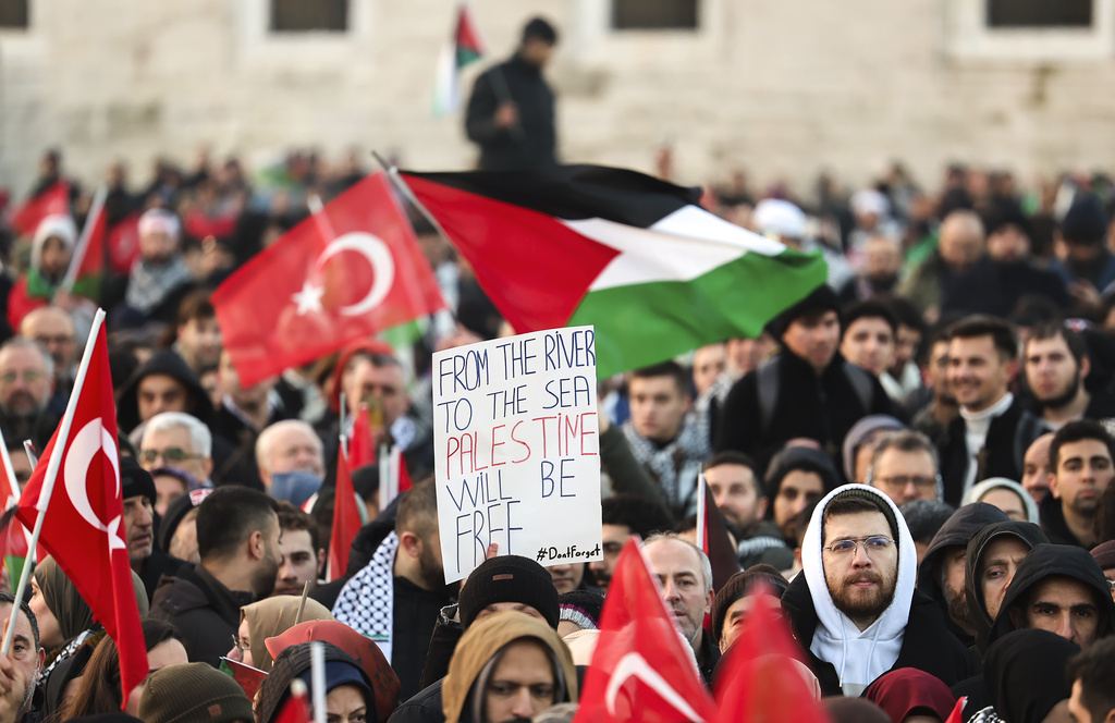 ISTANBUL (AP) — Tens of thousands of people gathered on Istanbul’s Galata Bridge on New Year’s Day on Wednesday to express solidarity with Palestinians in Gaza.